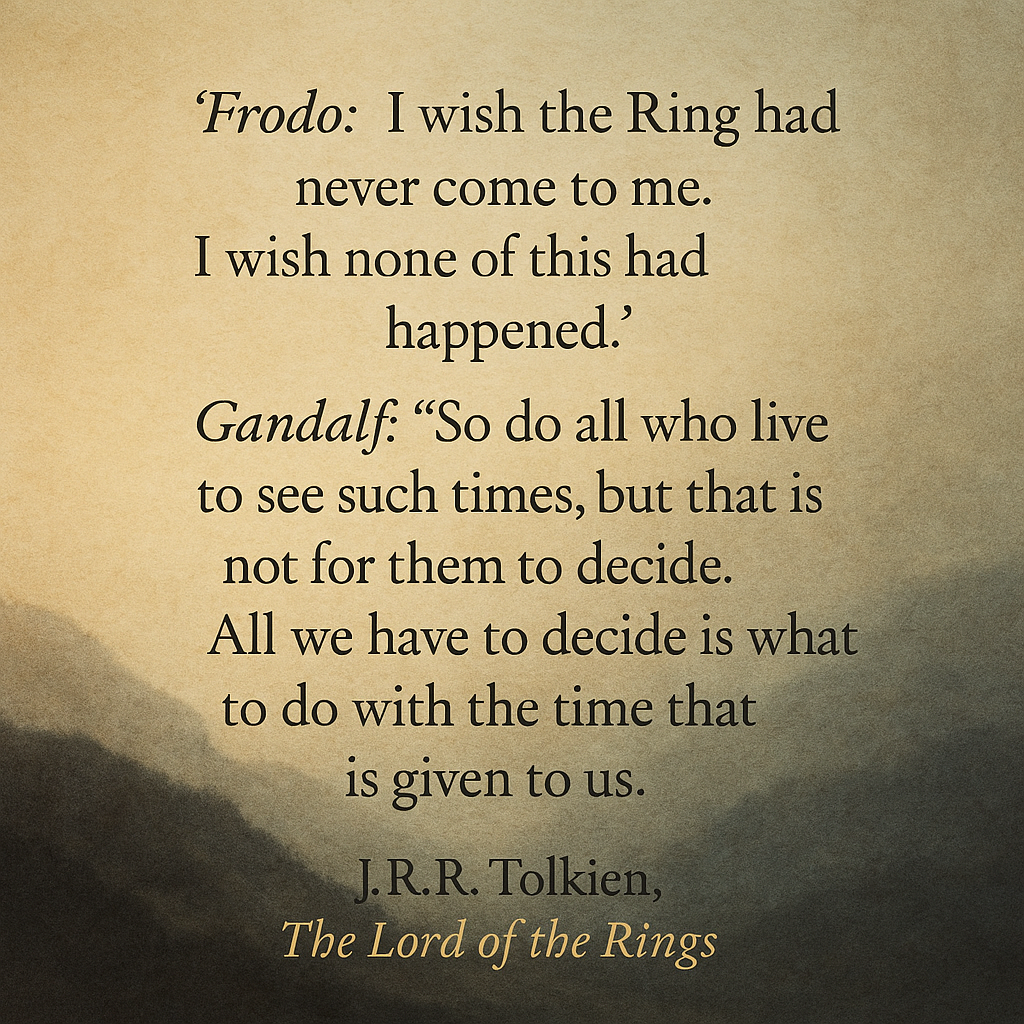 The image above captures that tension so well: the longing for a world without the burden, and the sober wisdom that reminds us we don’t get to choose the times we live in—only what we do with them.